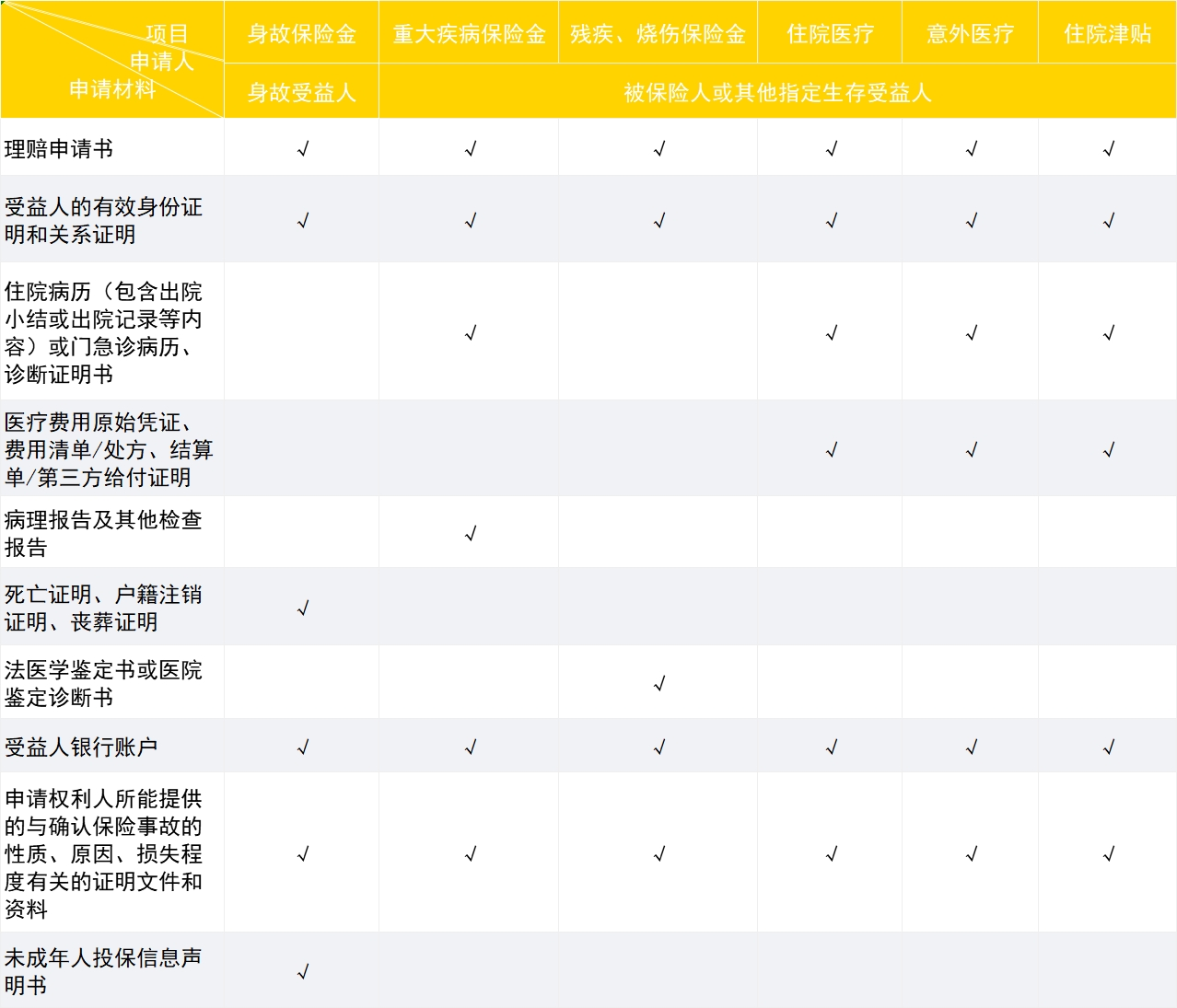 理賠所需資料一覽表